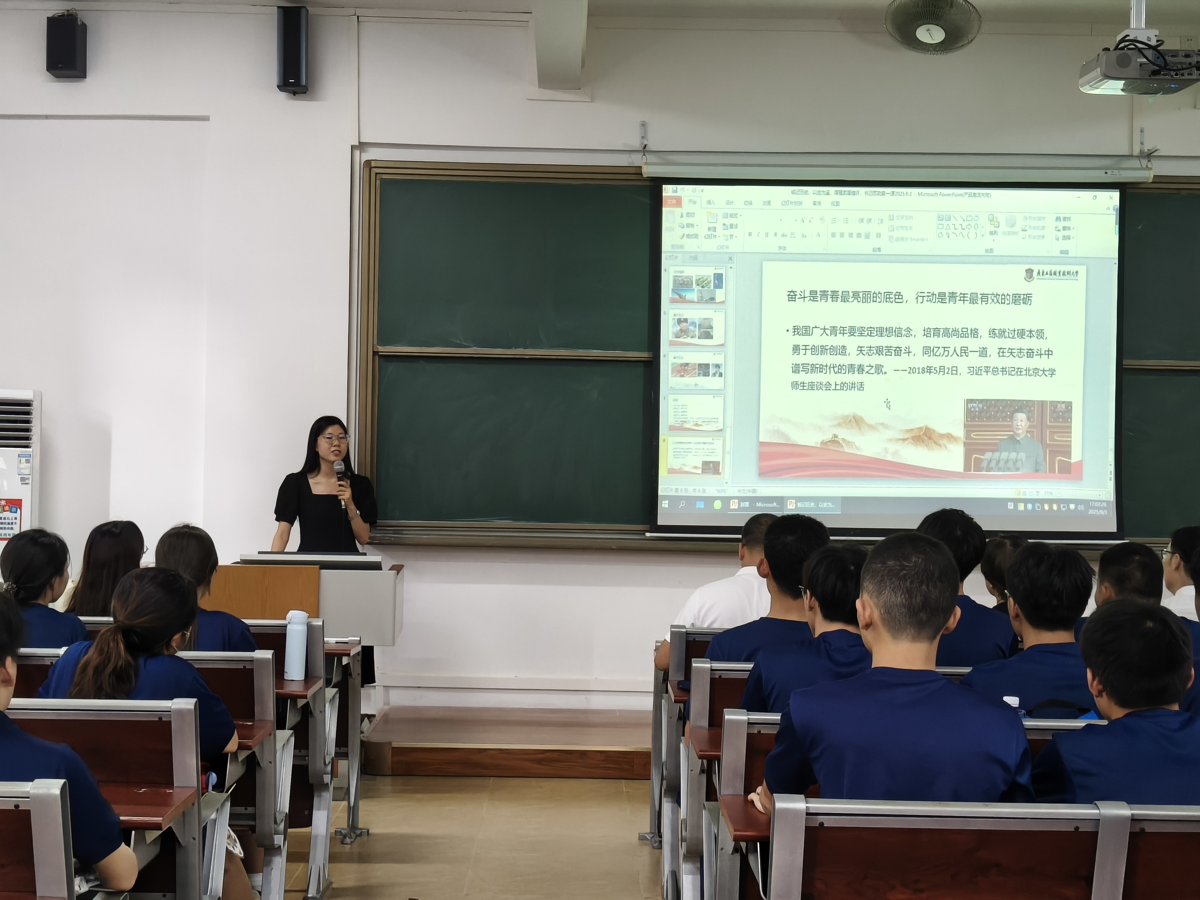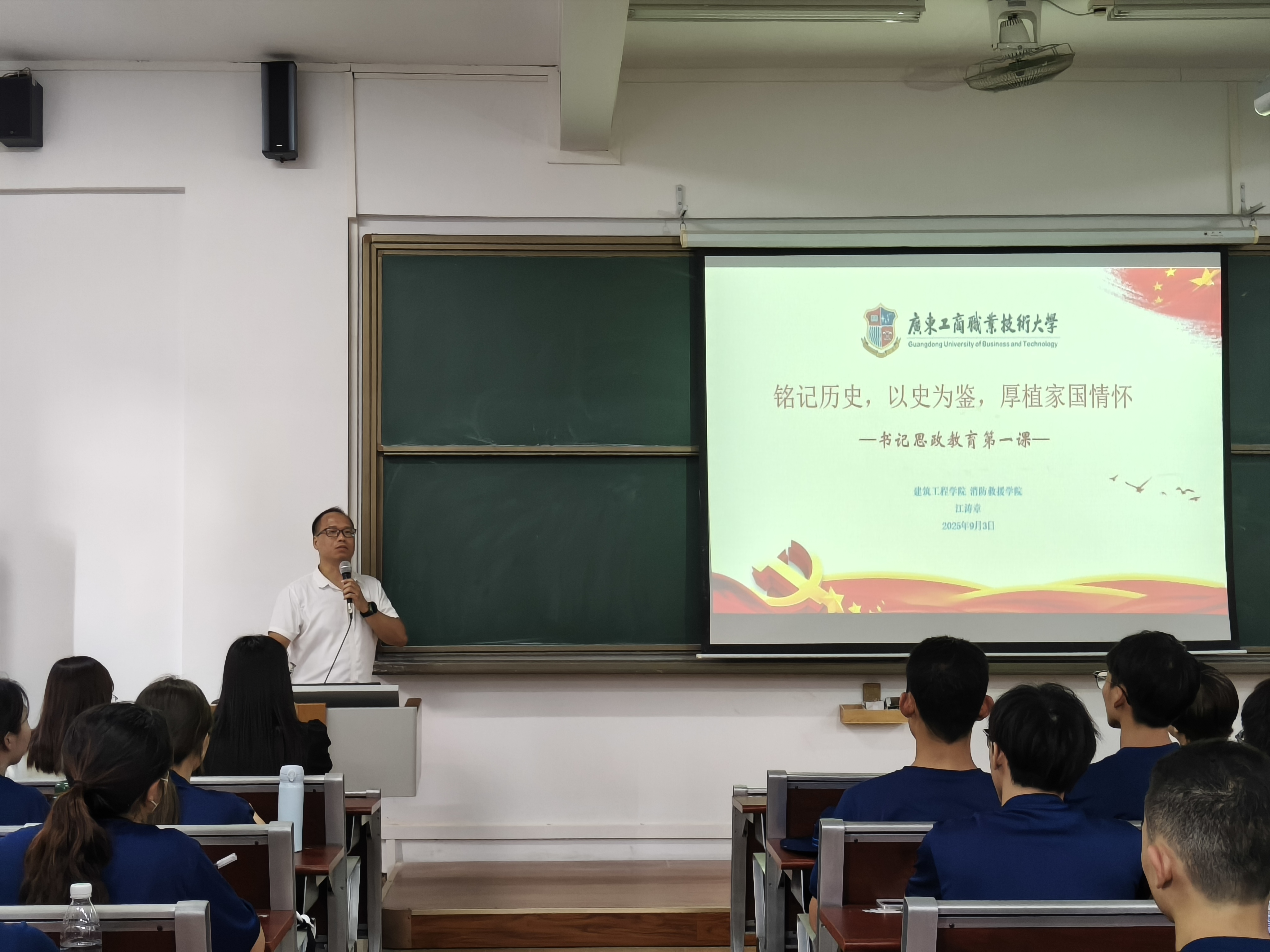 随后,江涛章以“铭记历史、以史为鉴、厚植家国情怀”为题讲授思政第一课。他首先以九三阅兵庆祝中国人民抗日战争暨世界反法西斯战争胜利为切入点,指出本次阅兵,是为了纪念中国人民经过长达14年艰苦卓绝的斗争,取得的抗日战争伟大胜利,以及世界反法西斯战争的完全胜利。在历史回顾环节,南京大屠杀、抗美援朝以及北约袭击中国驻南斯拉夫大使馆等重大历史事件被详细讲述。血雨腥风的战争岁月、无数同胞的苦难遭遇以及先辈们不屈不挠的抗争精神,通过生动的讲解与鲜活的图片资料,栩栩如生地呈现在同学们眼前,让大家深刻认识到和平来之不易,铭记历史是每个人的责任。