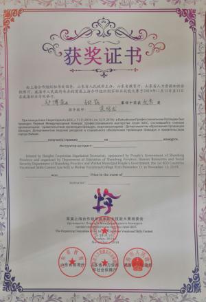 2019年11月11日-13日,2019年首届上海合作组织国家职业技能大赛在威海职业学院举行。本次比赛是由上海合作组织秘书处倡导,人力资源和社会保障部备案,山东省人民政府主办,山东省教育厅、山东省人力资源和社会保障厅、威海市人民政府承办,威海职业学院具体实施。建筑工程系建设工程管理专业学生郑博深同学荣获砌筑赛项优秀奖,梁绍龙老师荣获优秀指导教师奖。