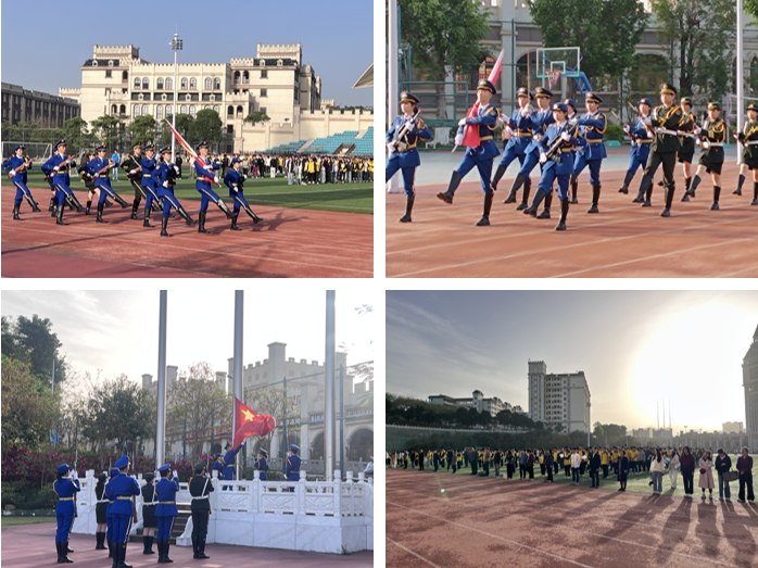师生列队肃立,国旗护卫队护送五星红旗庄严升起,全场齐唱国歌。