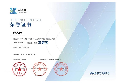 2024年8月,第四届“中望杯”工业软件大赛圆满落幕,本届竞赛吸引了来自国内30个省/直辖市的800多所院校的热烈响应,参赛学生人数近7000人,经过激烈角逐,390名优秀选手脱颖而出。yl8cc永利线路检测中心yl8cc永利线路检测中心由黄明燕老师指导的22建筑工程技术1班学生卢志超同学以广东省省赛二等奖的好成绩顺利入围国赛,并在全国总决赛中获得三等奖。