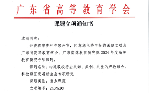 yl8cc永利线路检测中心院长沈丽教授申报的《构建政校行企共融、共创、共生的产教融合、科教融汇发展新生态专项研究》项目,获广东省高等教育学会2024年重点项目立项。课题将在分析当前产教融合、科教融汇的现状和问题的基础上为构建政校行企多方参与、互利共赢、可持续发展的产教融合、科教融汇发展新生态系统提供参考建议。课题的研究成果将对职业本科的发展提供有利环境有一定促进作业,同时有利于学院开展产教融合的深度开展。